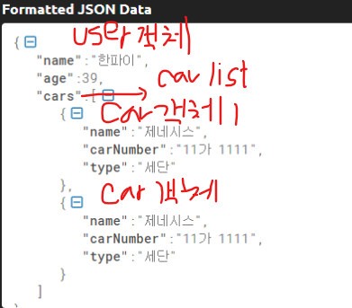 (User라는 객체안에, cars 라는 car객체를 담는 리스트를 넣어서 car객체1 ,2를 User객체 안에 넣을 수 있다.)