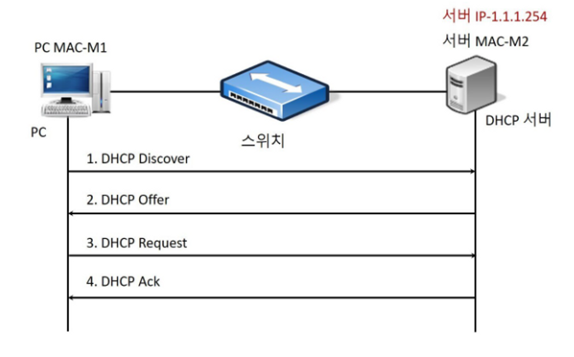 - DHCP Discover - PC 단말기가 DHCP 서버를 찾기 위해 Discover 메세지를 이더넷에 보낸다.