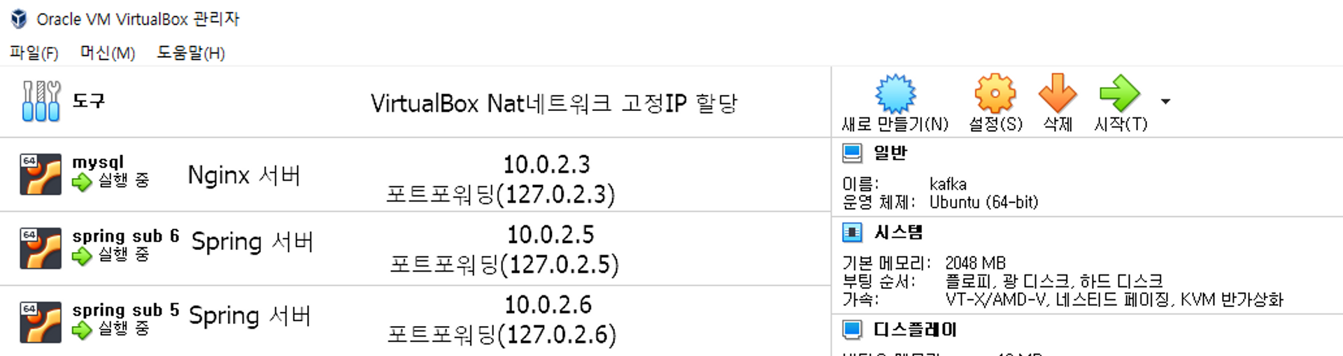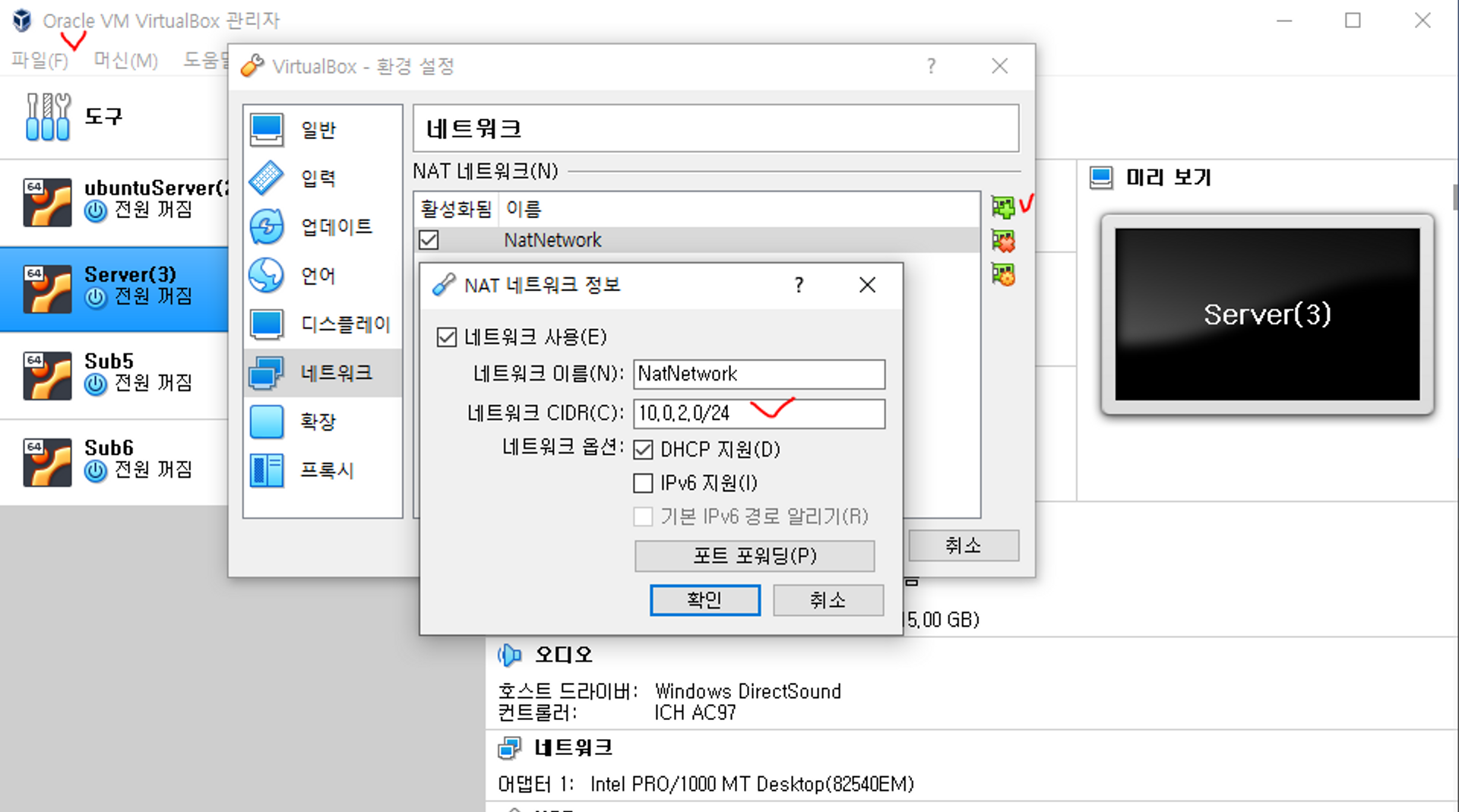 VirtualBox 네트워크 설정에서 NAT Network 만들고, 사이더(대표IP)를 지정한다.