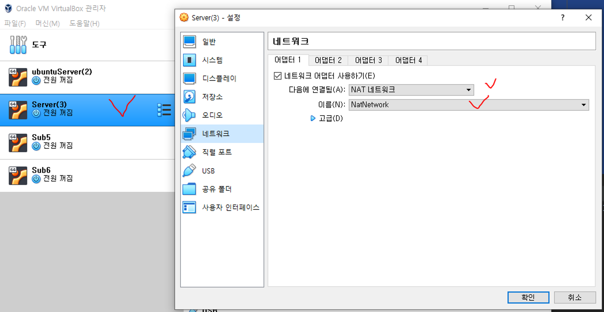 그 다음 우분투 서버 네트워크 설정에 들어가서 어댑터1에 만들어 놓은 NAT 네트워크를 지정한다.