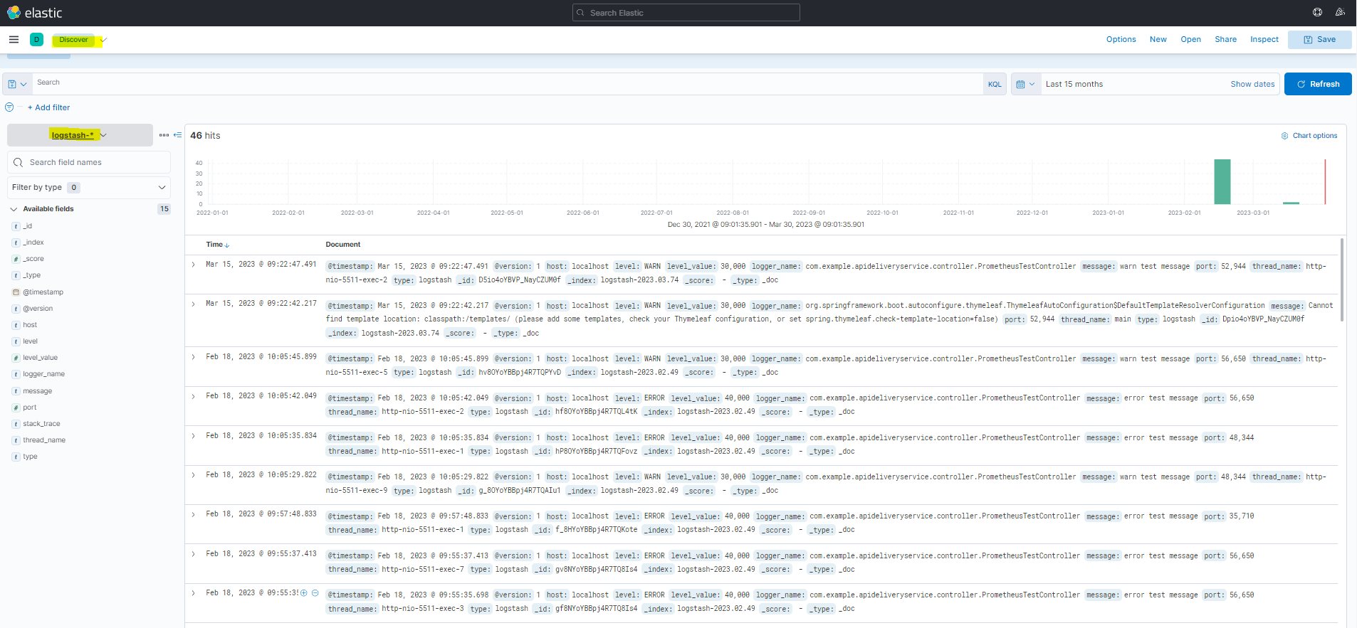 이제 Discover에서 내가 만든 패턴인 logstah-*를 검색해서 시간별, 조건별로 로그를 확인할 수 있다.
