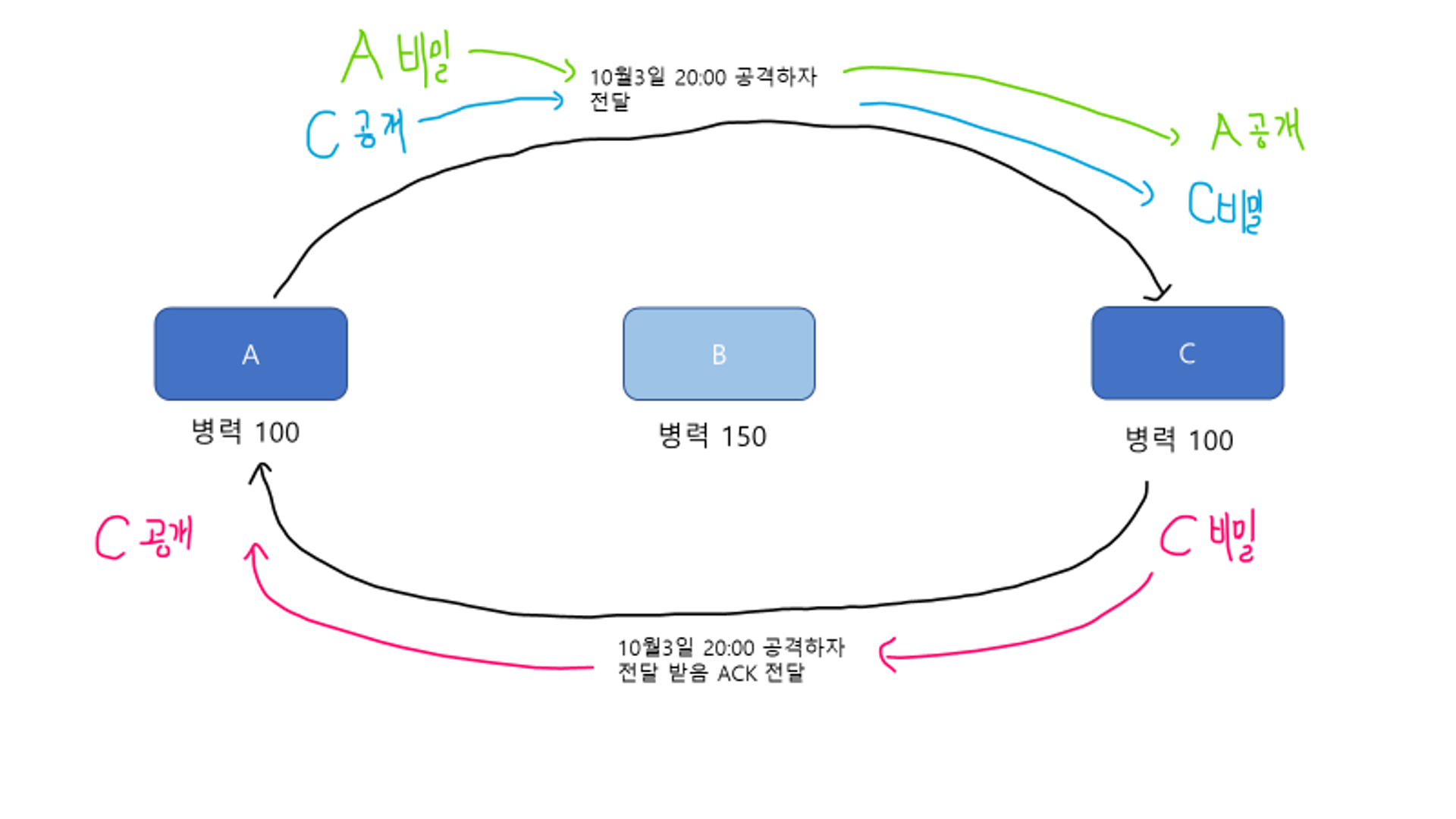 - 파란색 선은 B가 A의 정보를 탈취한 후, 다른 시간으로 바꿔서, B에게 전달 하고, B는 잘못된 정보인지 모르고 ACK를 날려 서로 다른 시간에 공격을 해서 패배하게 된다.