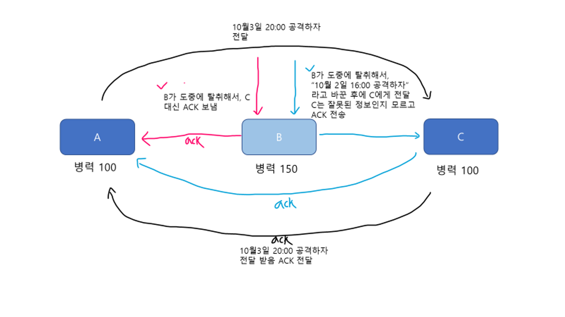 - 파란색 선은 B가 A의 정보를 탈취한 후, 다른 시간으로 바꿔서, B에게 전달 하고, B는 잘못된 정보인지 모르고 ACK를 날려 서로 다른 시간에 공격을 해서 패배하게 된다.