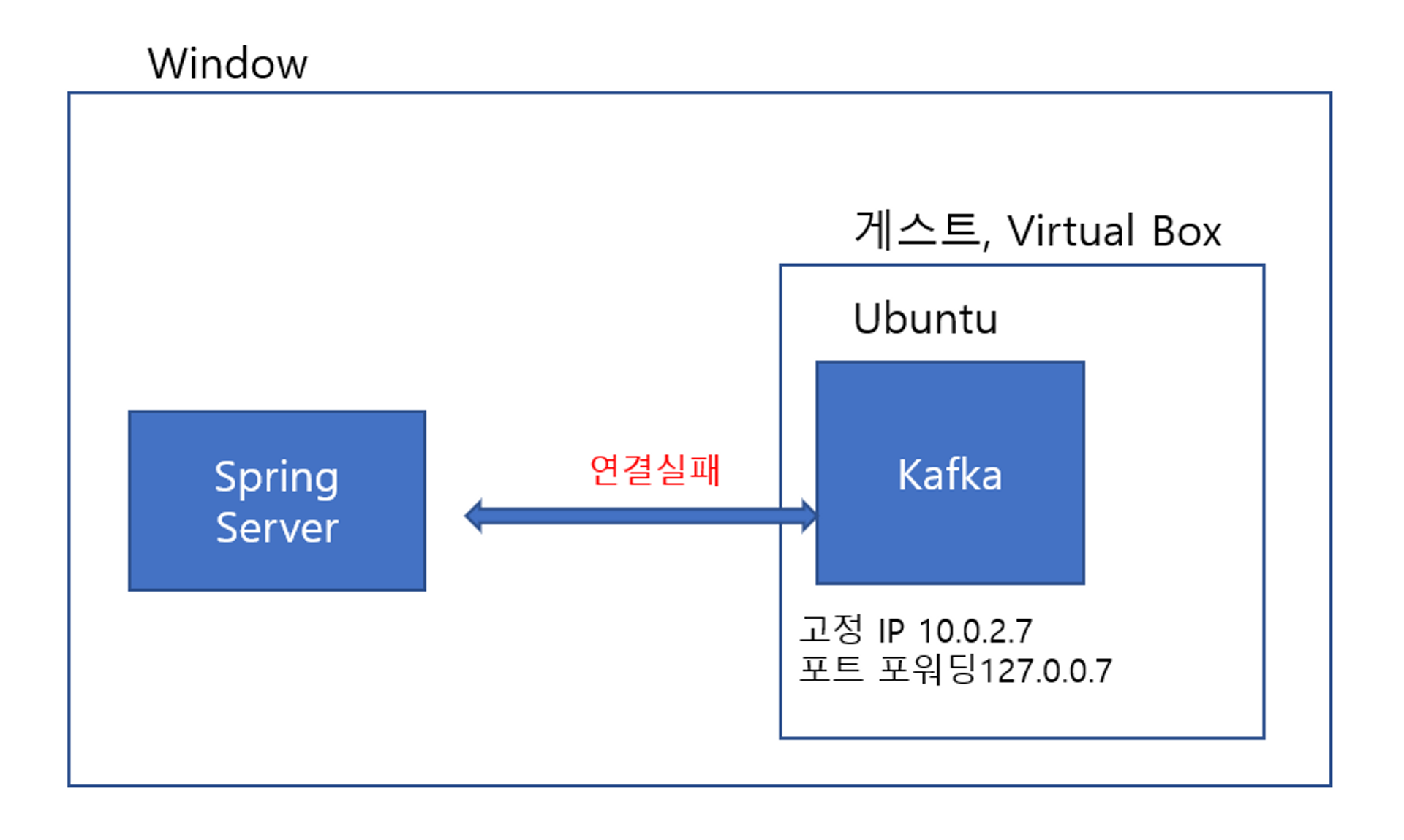 (호스트 Window) 환경에서 실행하는 Spring Server와, Window 내부의 VirtualBox-포트포워딩 - Ubuntu)에서 실행되는 Kafka가 연결이 되지 않는 문제가 발생했다. 이번 글에서는 (Virtualbox-포트포워딩) Kafka와 호스트 Window Spring Server 연결을 시키는 설정 방법에 대해서 알아보겠다.