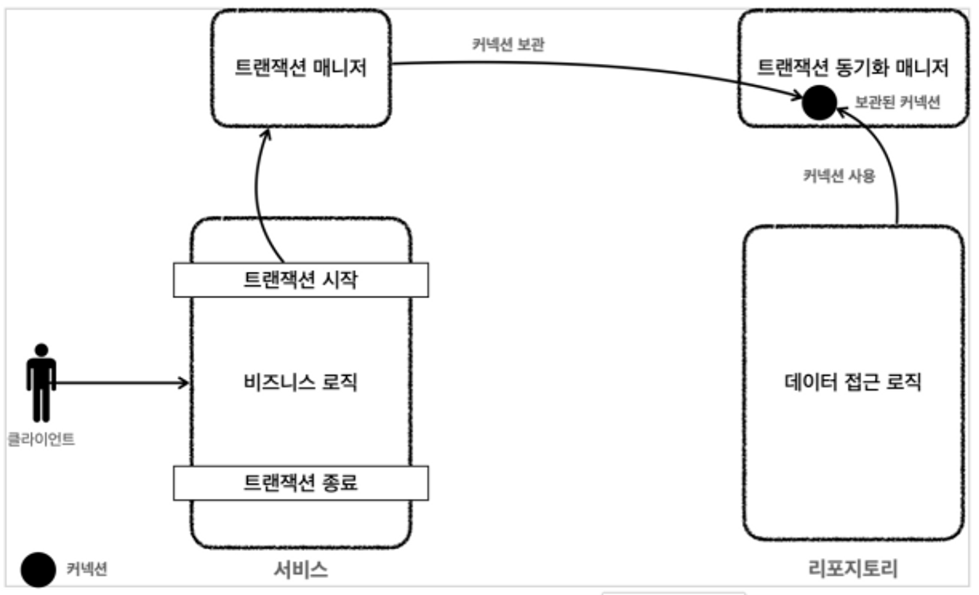 - 트랜잭션 매니저는 트랜잭션이 시작된 커넥션을 트랜잭션 동기화 매니저에 보관한다.