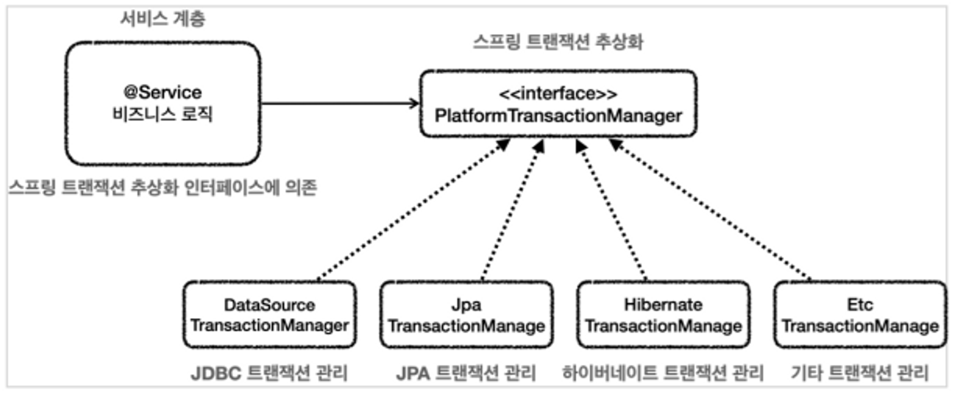 그래서 어떤 기술을 쓰든 같은 코드를 써서 트랜잭션을 처리할 수 있도록 트랜잭션 인터페이스를 만들어서 추상화 작업이 필요하다.