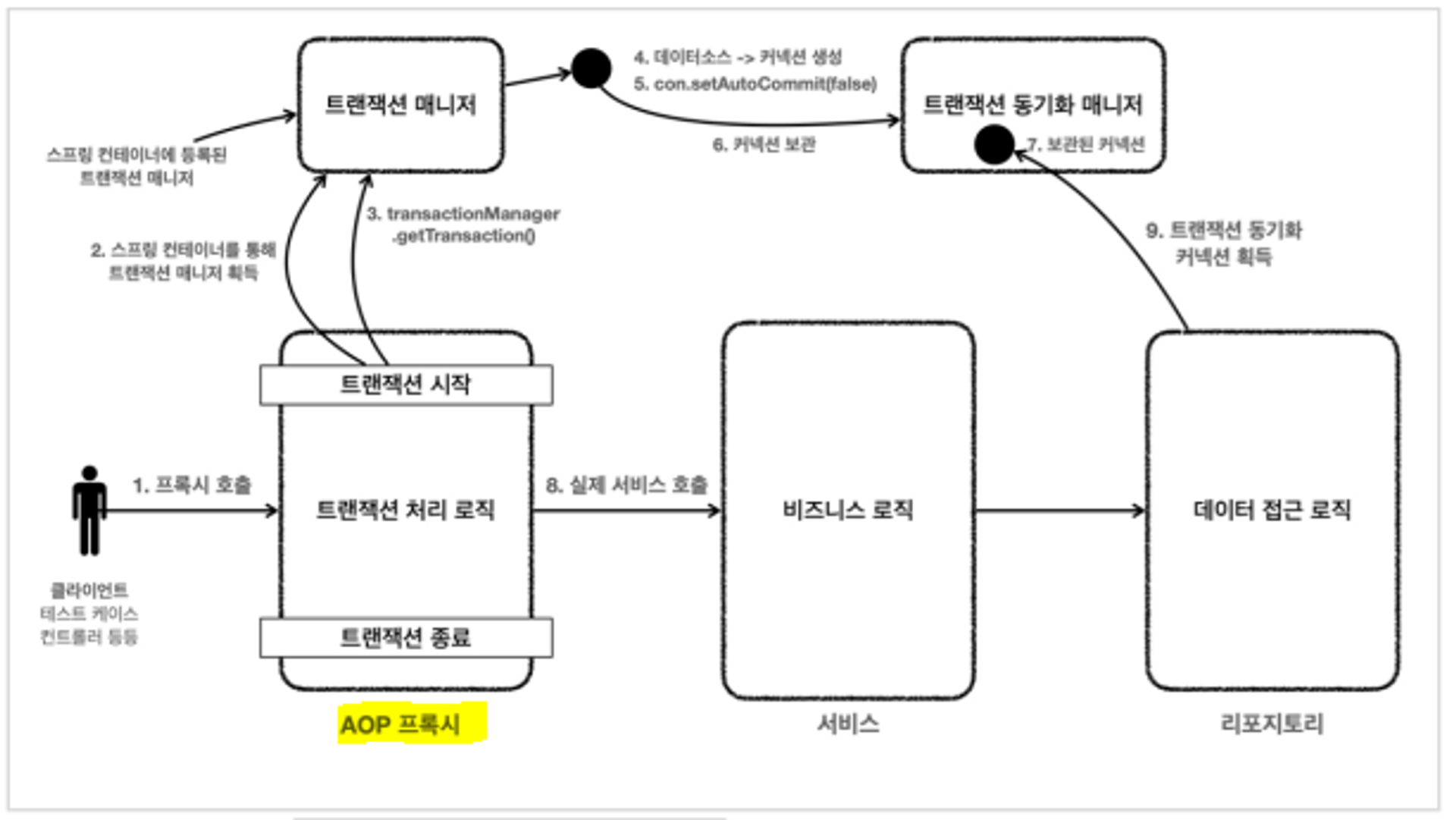- 트랜잭션이 종료되면 트랜잭션 매니저는 트랜잭션 동기화 매니저에 보관된 커넥션을 통해 트랜잭션을 종료하고 커넥션을 닫는다.