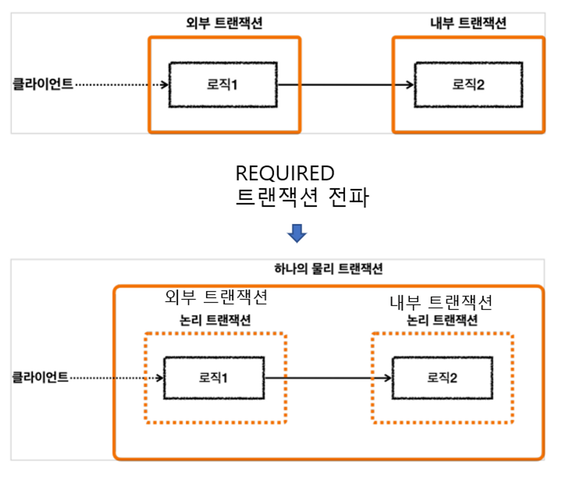 - 스프링은 두 트랜잭션을 논리 트랜잭션으로 개념을 설정하고