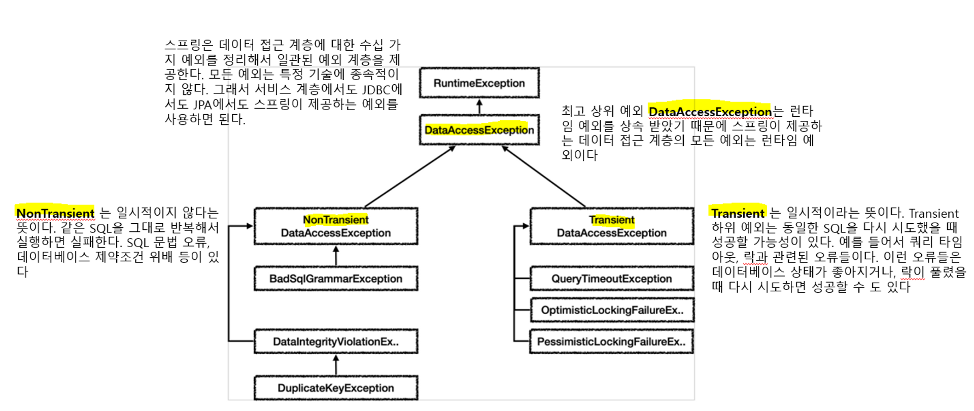 스프링은 앞서 설명한 문제들을 해결하기 위해 데이터 접근과 관련된 예외를 추상화해서 제공한다.