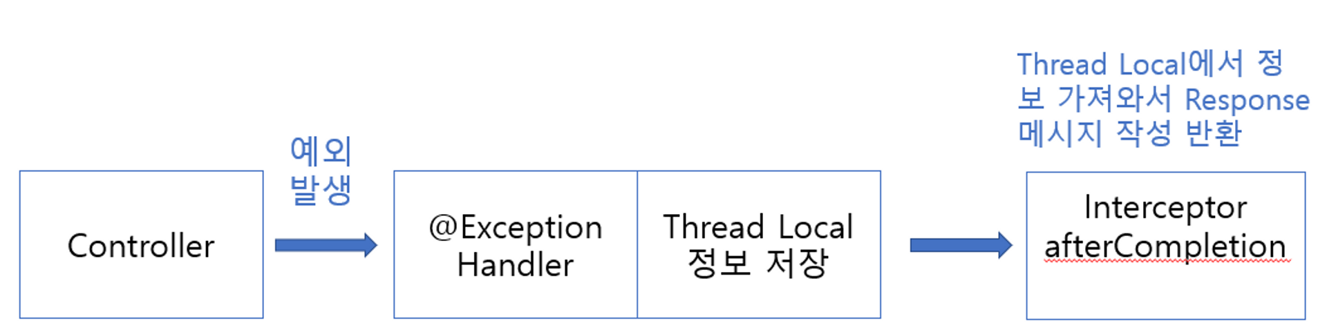 작동 과정은 컨트롤러에서 예외가 발생하면, @ExceptionHandler 메소드에서 예외를 잡아 해당 예외에 맞는 Response 정보를 ThreadLocal에 저장한다.