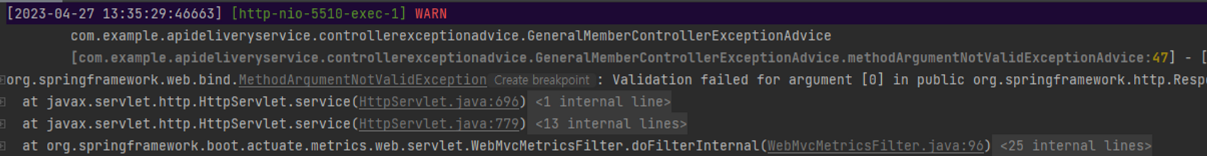 그리고 검증에 오류가 있다면 MethodArgumentNotValidException 예외가 발생하여 잘못된 형식 데이터를 찾아낸다.