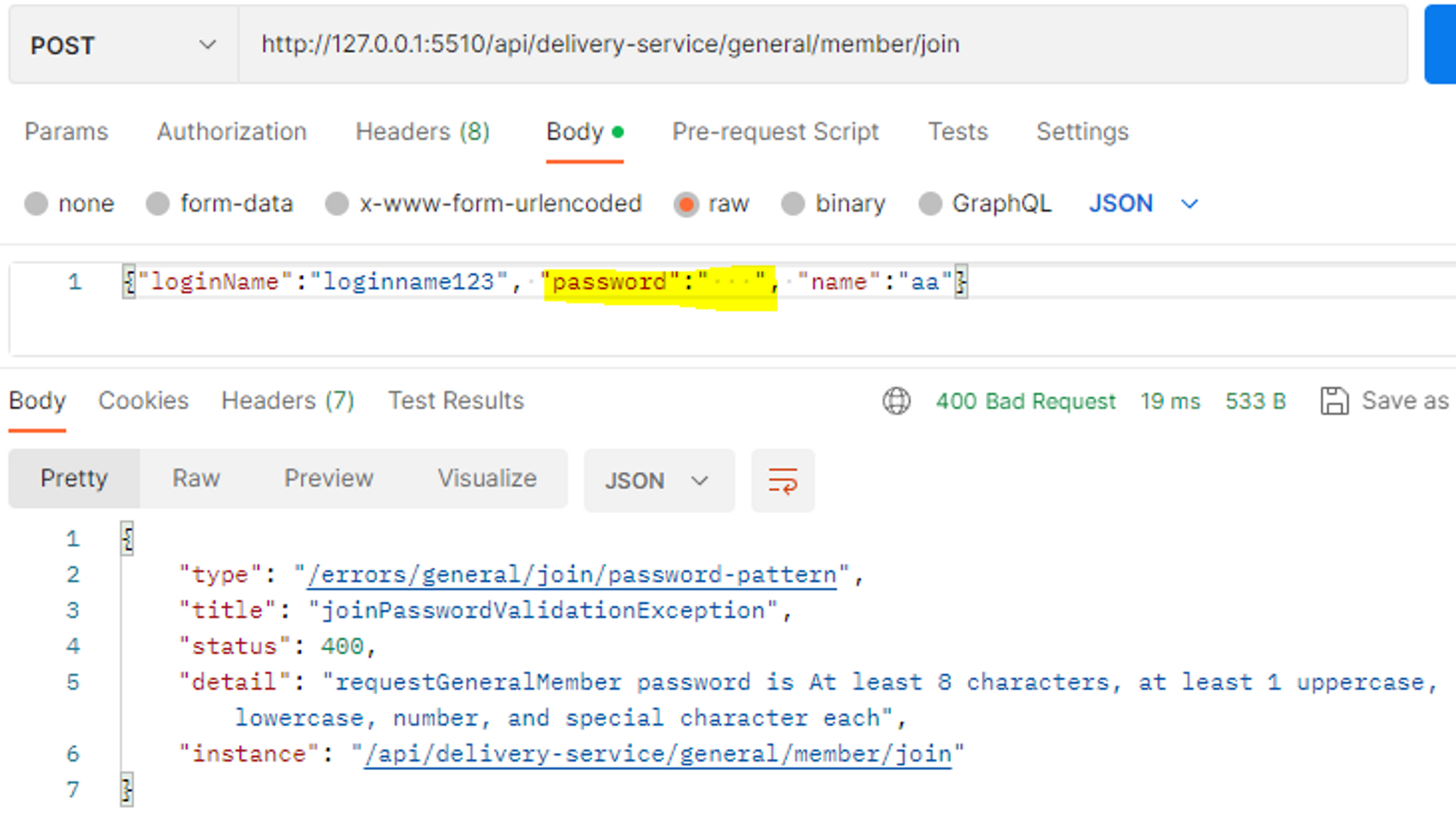 password 데이터를 공백으로 넘겼더니, 예외를 발생해서 400 status code를 반환한 것을 확인할 수 있다.