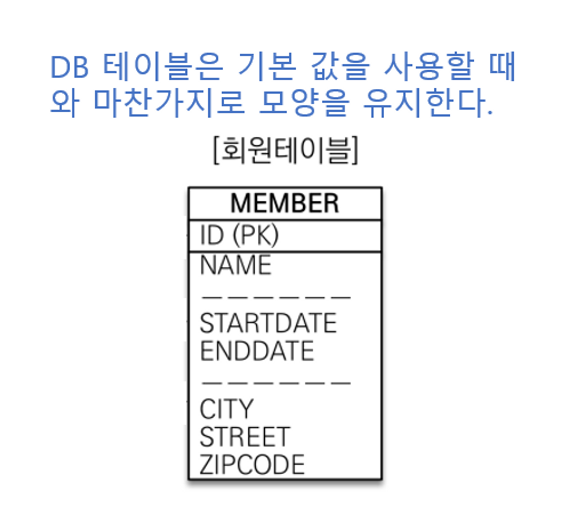 임베디드 타입을 사용하기 전과 후에 매핑하는 테이블은 같다. JPA 코드만 달라질 뿐이다.