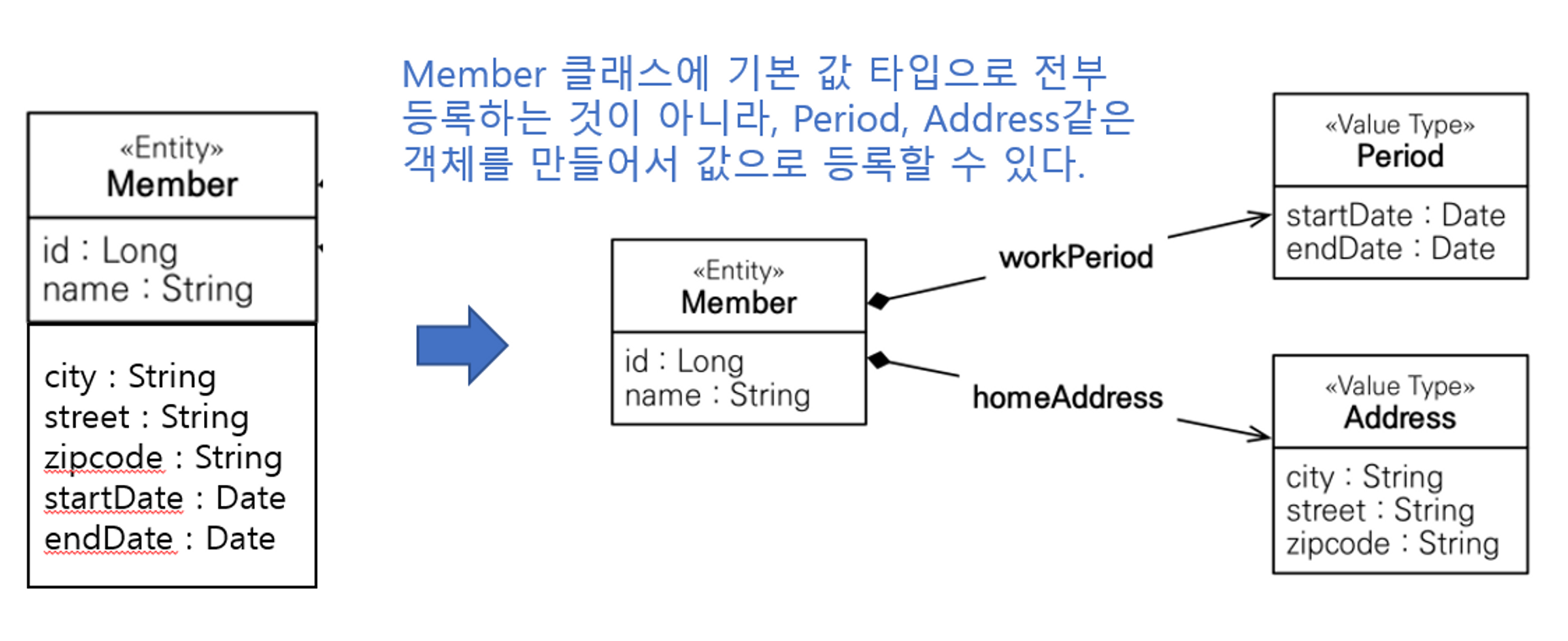 기본 값을 모아서 객체 자체를 값으로 사용한다. 아래 같은 예시로 기본 값 타입으로만 구성하는 것이 아니라, 기본 값 타입들을 묶어서 만든 객체를 값으로 등록 할 수 있다.