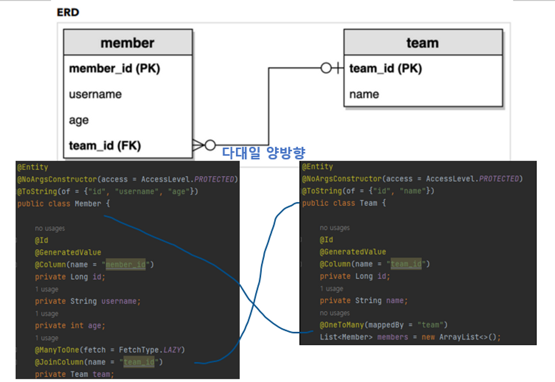 앞으로 나올 예제 쿼리들은 밑에 그림 테이블, 엔티티 구조를 사용한다.